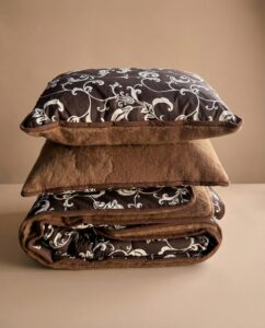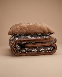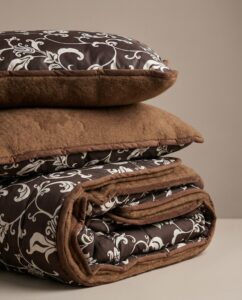Eine Seite des Sets besteht aus 45% Kamelwolle und 55% Merinowolle, die andere Seite ist aus 100% natürlicher Baumwolle gefertigt. Kamelwolle wird für ihre außergewöhnlichen Eigenschaften geschätzt – sie bietet ausgezeichnete Thermoregulation, Wärme im Winter und Kühle im Sommer.