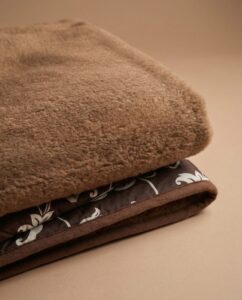Eine Seite der Decke ist aus einem Gemisch aus Kamel- und Merinowolle gefertigt, was zusätzliche Weichheit und Wärme verleiht. Die andere Seite ist aus 100% Baumwolle – sanft auf der Haut, natürlich und atmungsaktiv.