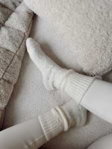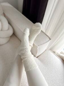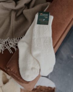 Die Socken regulieren die Temperatur auf natürliche Weise – sie halten die Füße bei Kälte warm und lassen sie atmen, was sie nicht nur für den Winter, sondern auch für wärmere Jahreszeiten geeignet macht. Wolle nimmt Feuchtigkeit gut auf und hält ein trockenes und angenehmes Gefühl aufrecht.