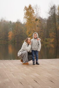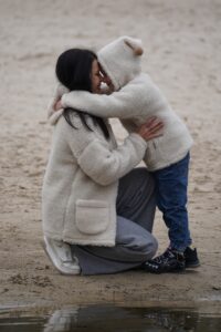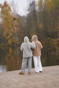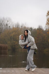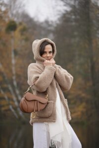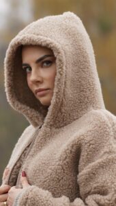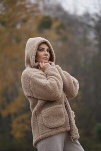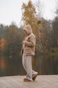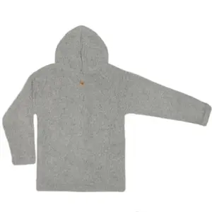 Weiche und sehr warme Kapuzenjacke. Mit zwei kleinen Taschen, Reißverschluss und Öko-Leder-Details.